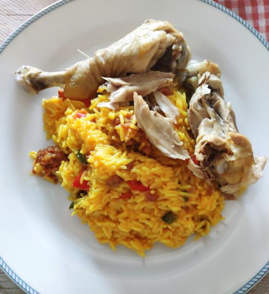 Arroz Sin lavar el vaso, incorpore el aceite y los dientes de ajo. Introduzca el cestillo con el arroz basmati, la sal y vierta encima el agua. Programe 20 minutos, temperatura 110°, velocidad 5, removiendo el arroz con la espátula 2 ó 3 veces a lo largo de la cocción. Cuando acabe el tiempo programado, vuelque el arroz sobre los ingredientes reservados. Añada el beicon troceado, mezcle con cuidado y sirva.