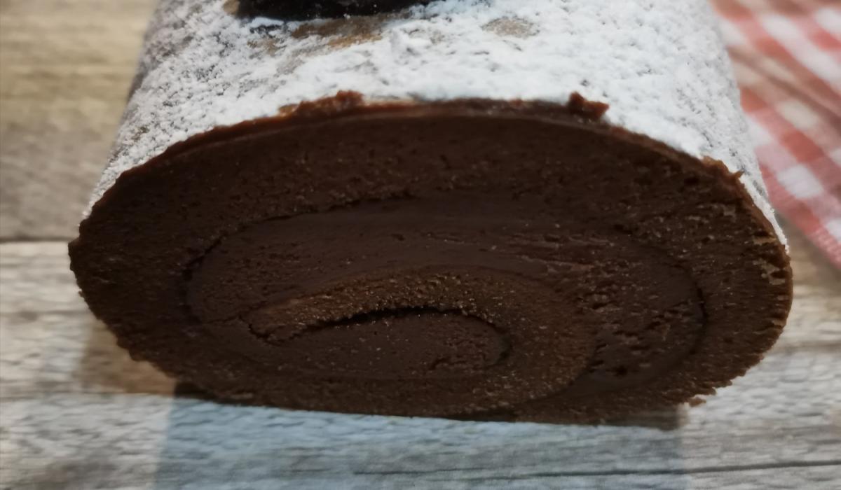 Estiramos la masa de bizcocho y rellenamos con la trufa, enrollamos y espolvoreamos un poco de azúcar glass y añadimos unas lágrimas de chocolate para decorar