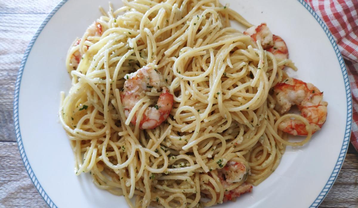Espaguetis con pesto y langostinos