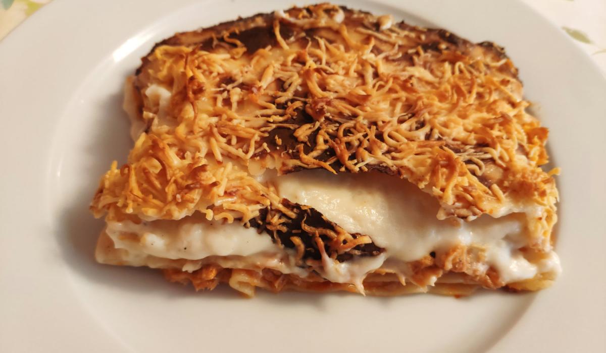 Rectificamos de sal, pimienta y nuez moscada al gusto.Cubrimos con la salsa bechamel nuestras lasañas y añadimos queso rallado.