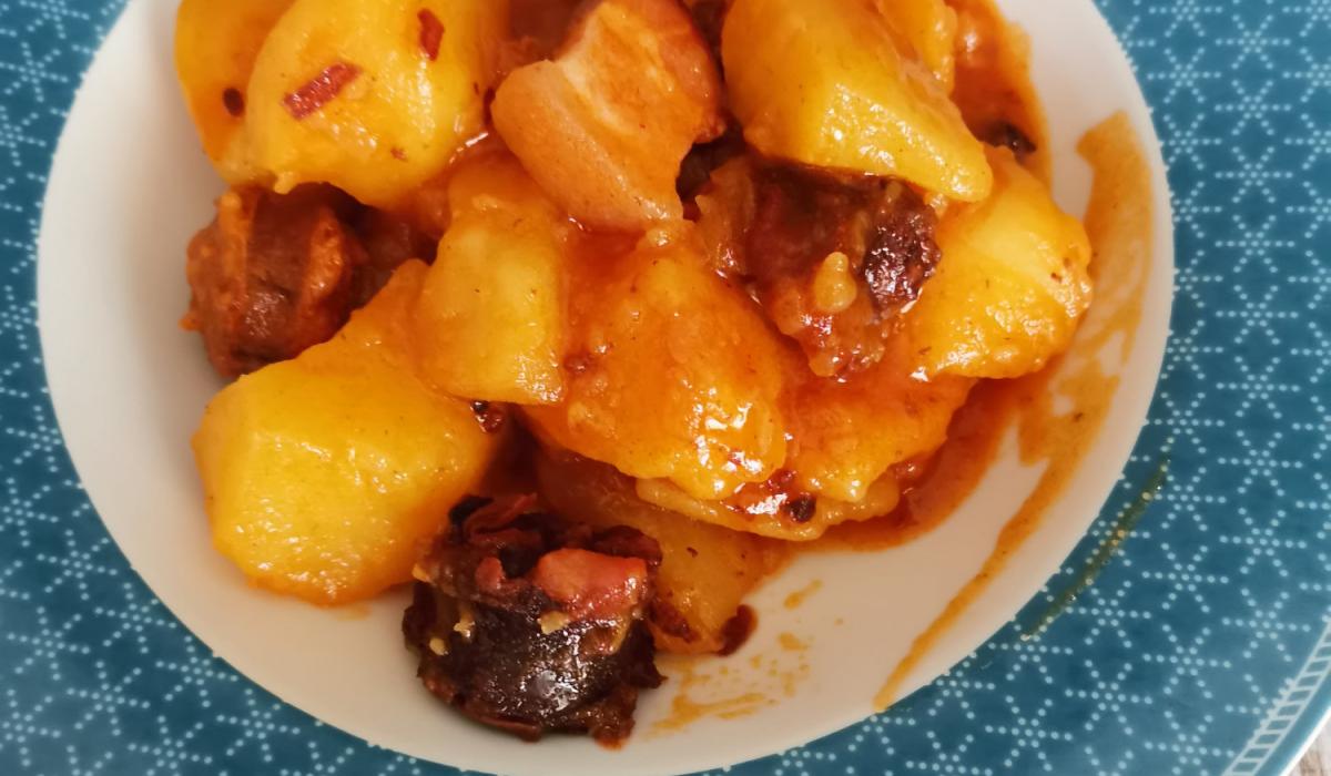 Añadimos 500gr de agua y 1kg de patatas nuevas sin piel, limpias y cortadas en cuartos