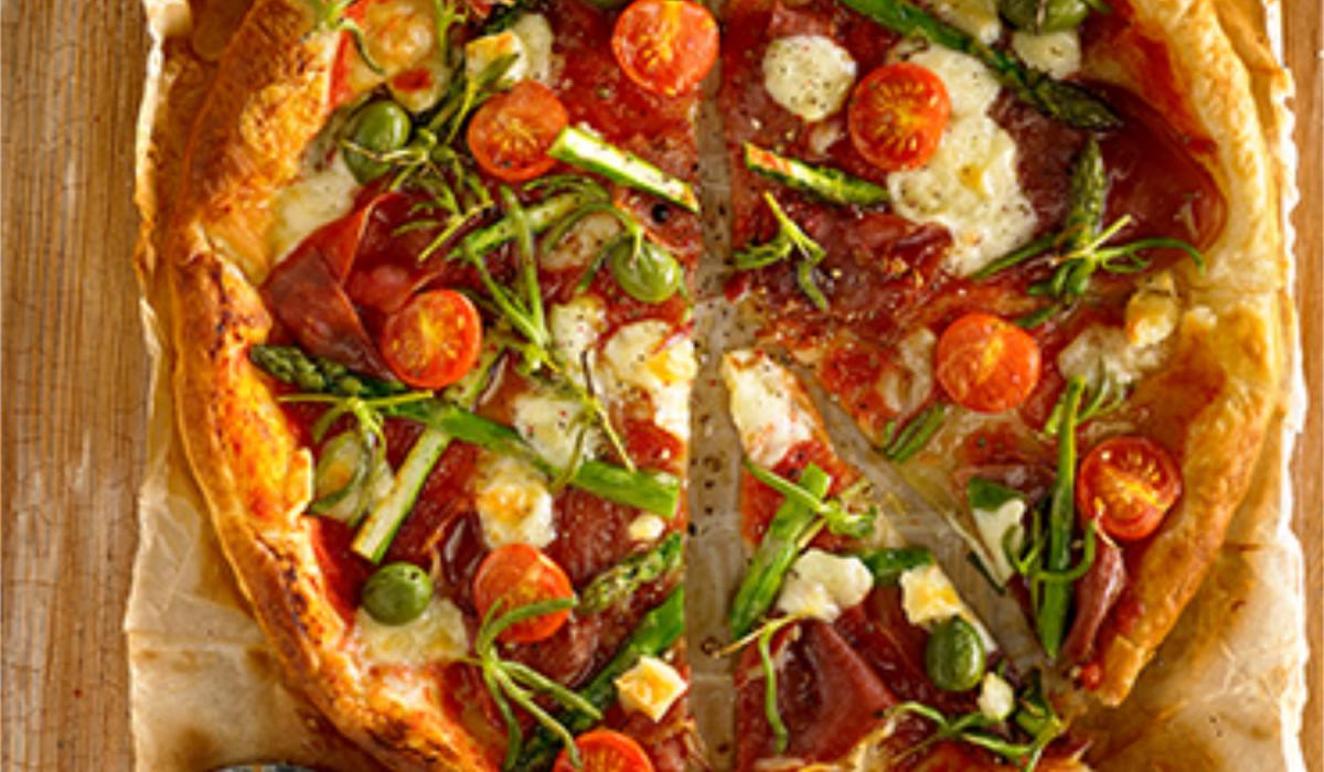 Pizza de queso manchego, partisano y espárragos