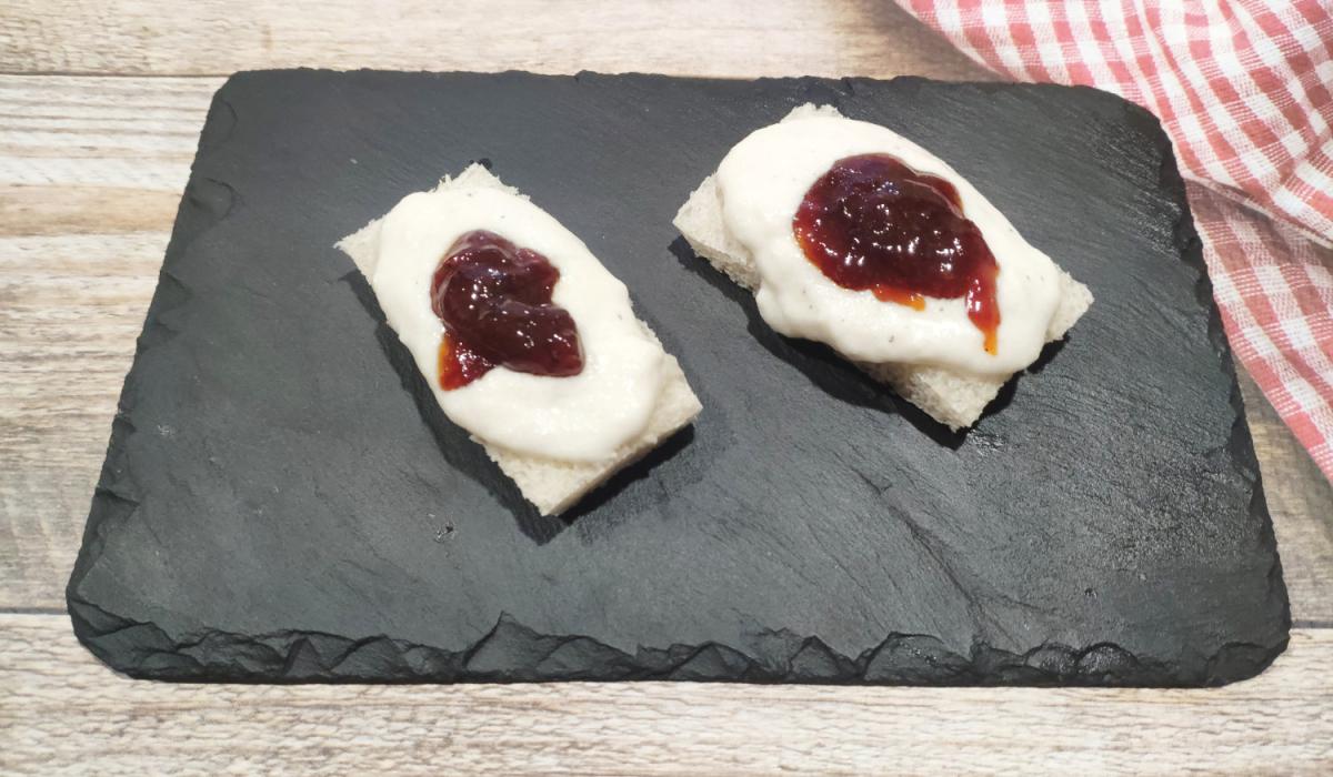 Montamos el plato, ponemos las tostadas y encima un poco de brandada de bacalao y pimientos caramelizados.